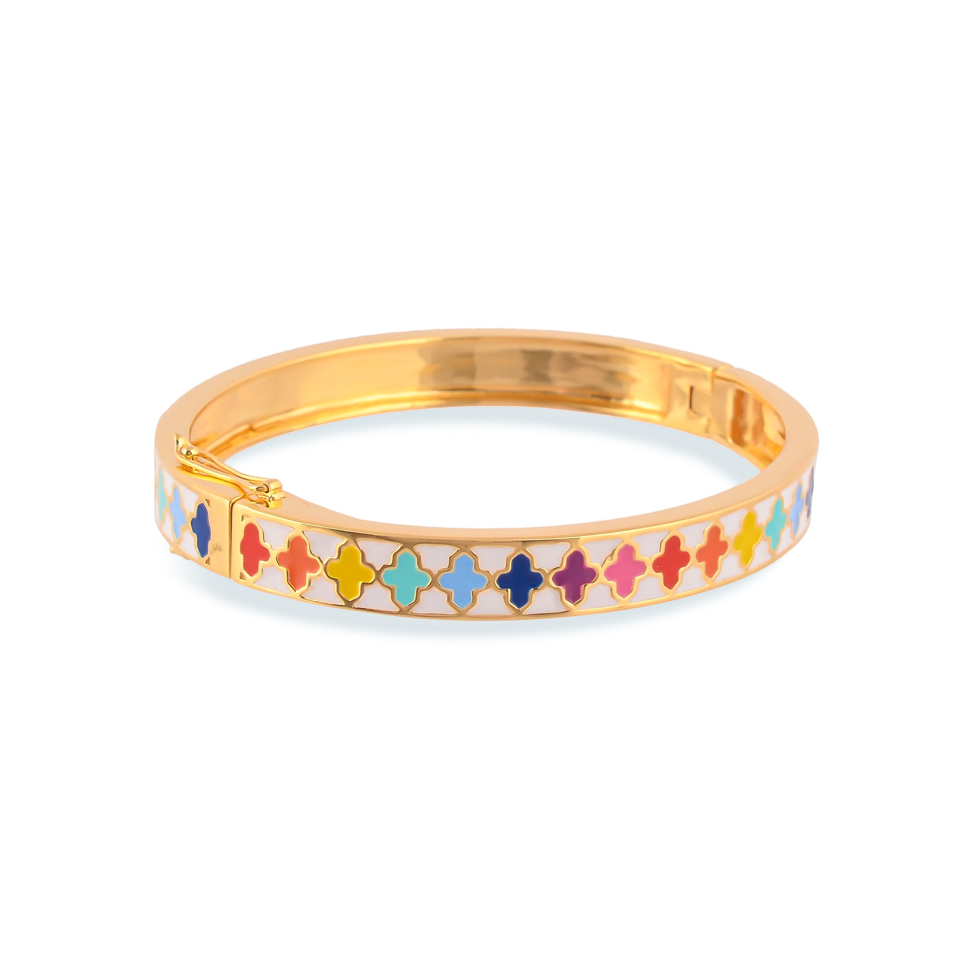 Inspired by mosaic patterns, colors, and calligraphy in Spanish architecture, the Andalusia collection offers everyday jewelry pieces that amplify this inspiration. Enamel work brings the vibrant color palette to life in each design. These reversible pieces, including a daily wear gold bracelet, can be stacked together or worn individually, creating complementary patterns.