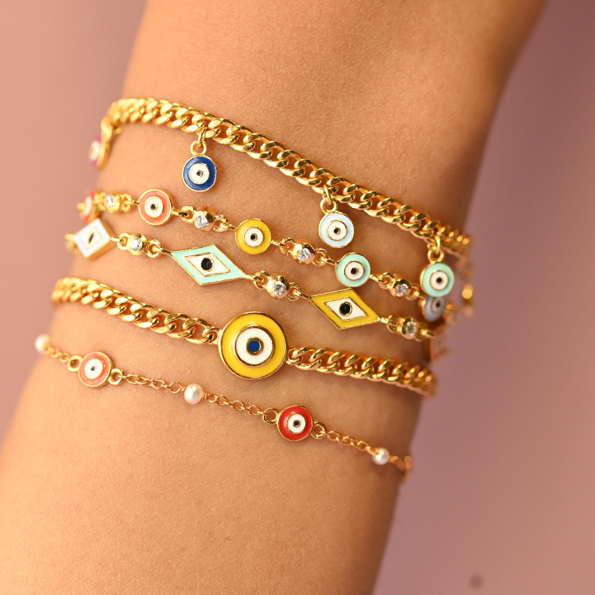 The Evil Eye Collection is our take on classic jewellery transformed with bold hues. Make sure you get your stack game on for that extra drama!